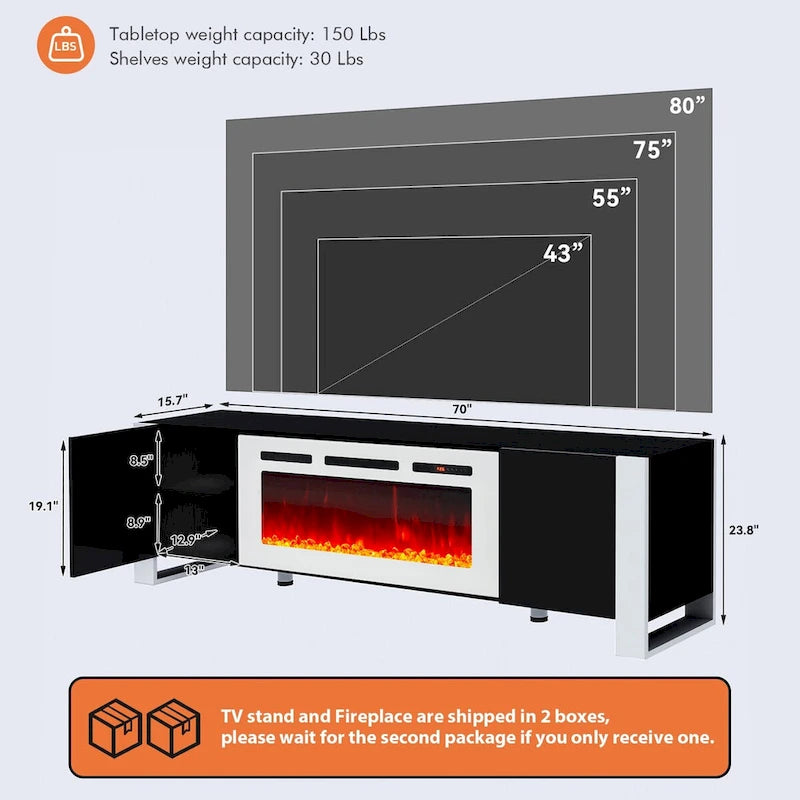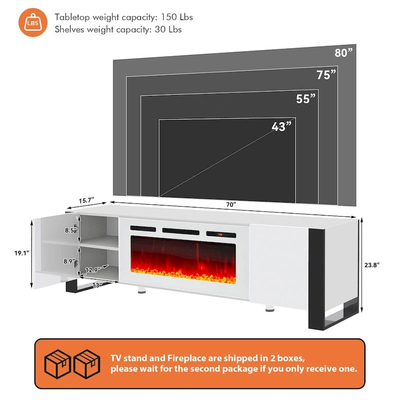 Large Space and Modern DesignFeaturing 2 closed cabinets with 2 adjustable shelves of each, this TV stand with fireplace provides sufficient storage space for personal items storage such as media devices, gaming consoles, DVDs, and other accessories. The table top is ideal to display potted plants, books or other decorations. Additionally, the modern minimalist appearance design adds a touch of elegance to your room. Overall dimension:70.1L x 15.7 W x 23.8 H.